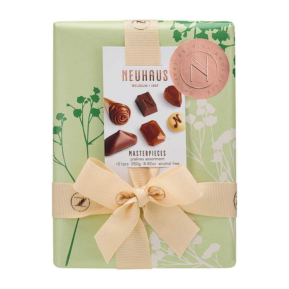 The Easter Timeless Masterpieces Ballotin (250 g) contains +/- 21 iconic Neuhaus chocolates: a selection of fresh cream, praliné, ganache or gianduja filled pralines. Presented in vibrant green spring tones and decorated with delicate floral illustrations inspired by blossoming nature, this ballotin is a graceful expression of Easter gifting. An elegant gift to share and savour, celebrating fine flavours and special moments during the Easter season.