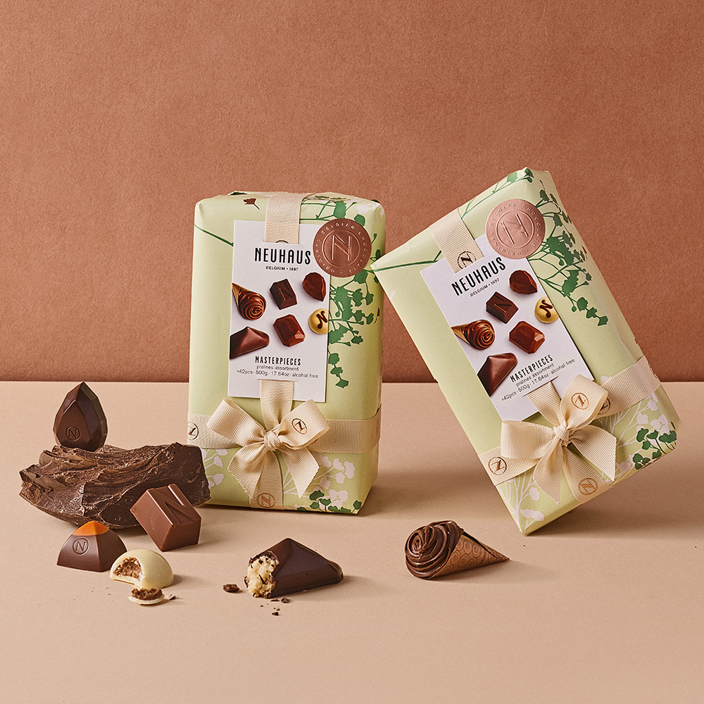 The Easter Timeless Masterpieces Ballotin (500 g) contains +/- 42 iconic Neuhaus chocolates: a selection of fresh cream, praliné, ganache or gianduja filled pralines. Presented in vibrant green spring tones and decorated with delicate floral illustrations inspired by blossoming nature, this ballotin is a graceful expression of Easter gifting. An elegant gift to share and savour, celebrating fine flavours and special moments during the Easter season.