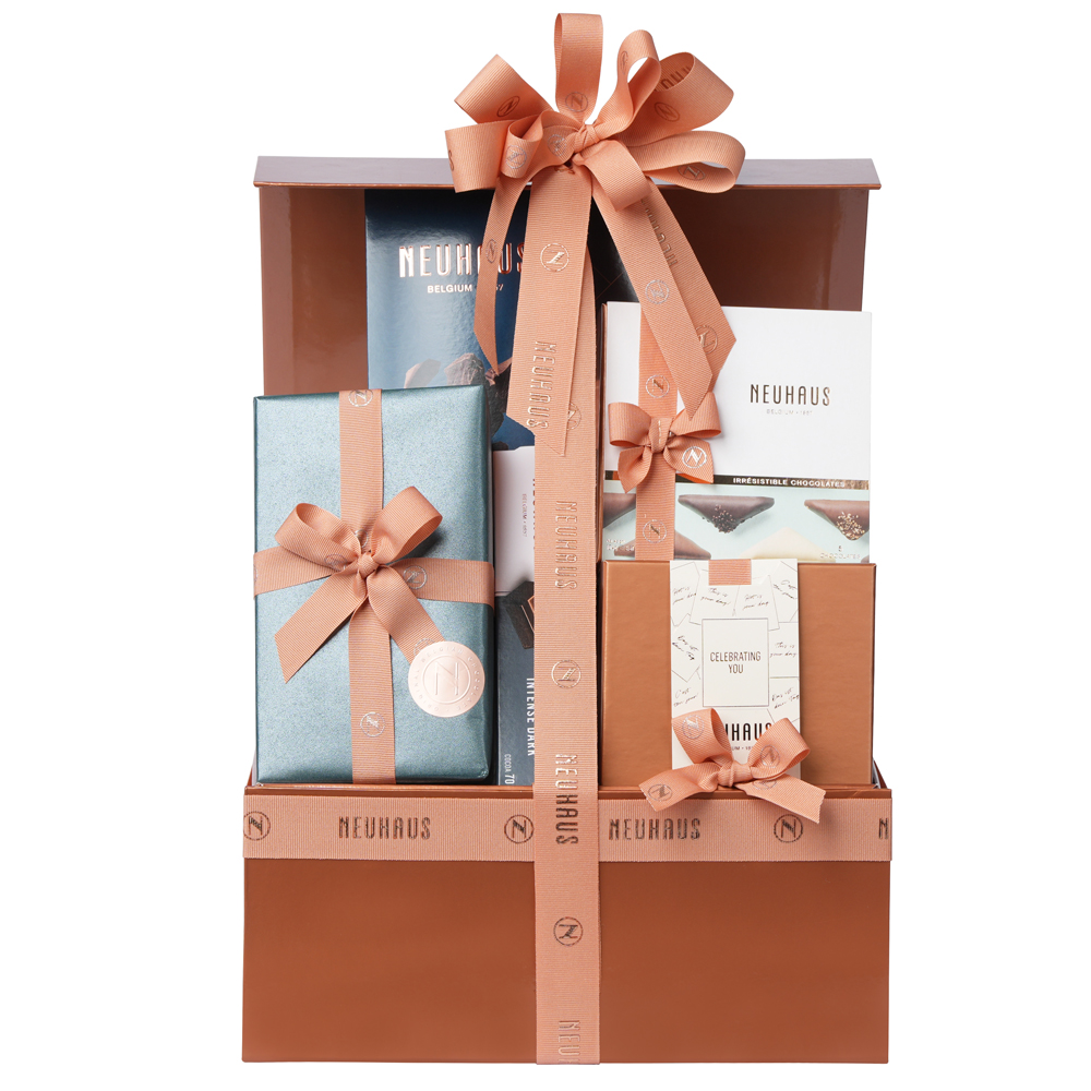 This elegant gift box is filled with: Tablet 80% Dark chocolate , bar intense dark, discovery irresistibles, ballotin filled with assorted amusettes and small gift box filled with assorted pralines.