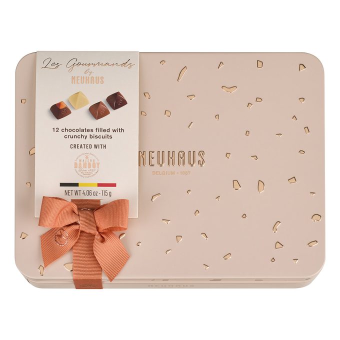 Delve into the exquisite “Les Gourmands Small” collection (115 g), an extraordinary collaboration between Neuhaus, the inventor of the Belgian praline, and Maison Dandoy, famed for their artisanal biscuits.