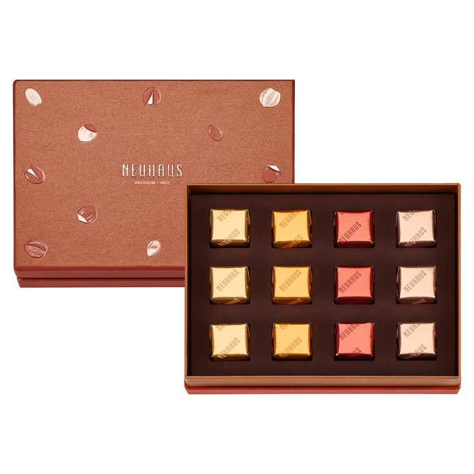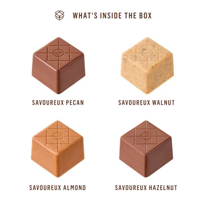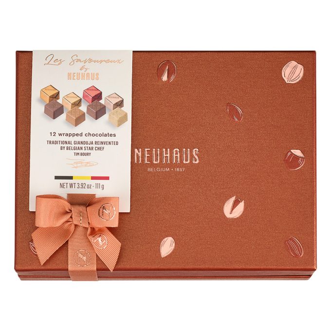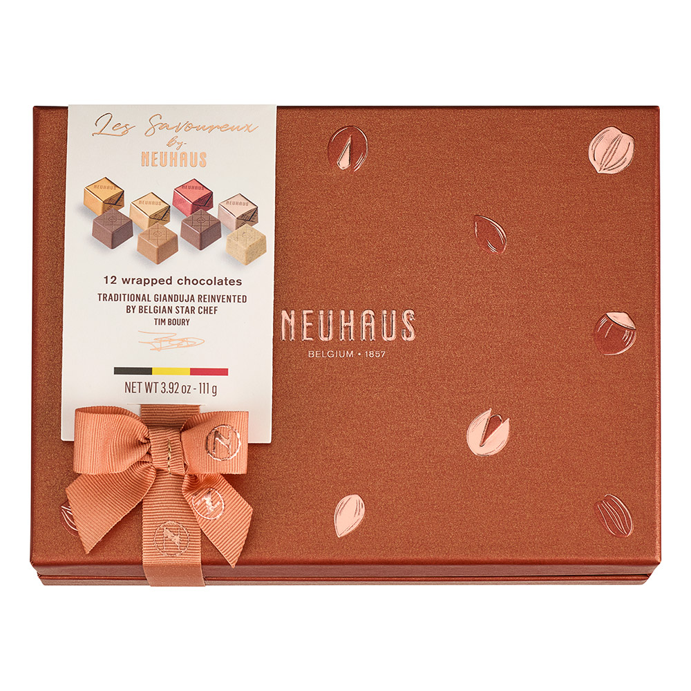 In collaboration with Belgian star chef Tim Boury, our Maîtres Chocolatiers have created a new assortment of chocolates inspired by classic gianduja: Les Savoureux (223 g). These cube-shaped creations offer a fresh interpretation of a traditional Italian recipe. They combine a silky texture and feature carefully selected ingredients. Exclusive to this large gift box are two indulgent creations: the velvety Les Savoureux Gianduja. Presented in a warm copper-toned box, this selection makes an elegant gift for holidays, birthdays, thank-you gestures, or any special occasion.
