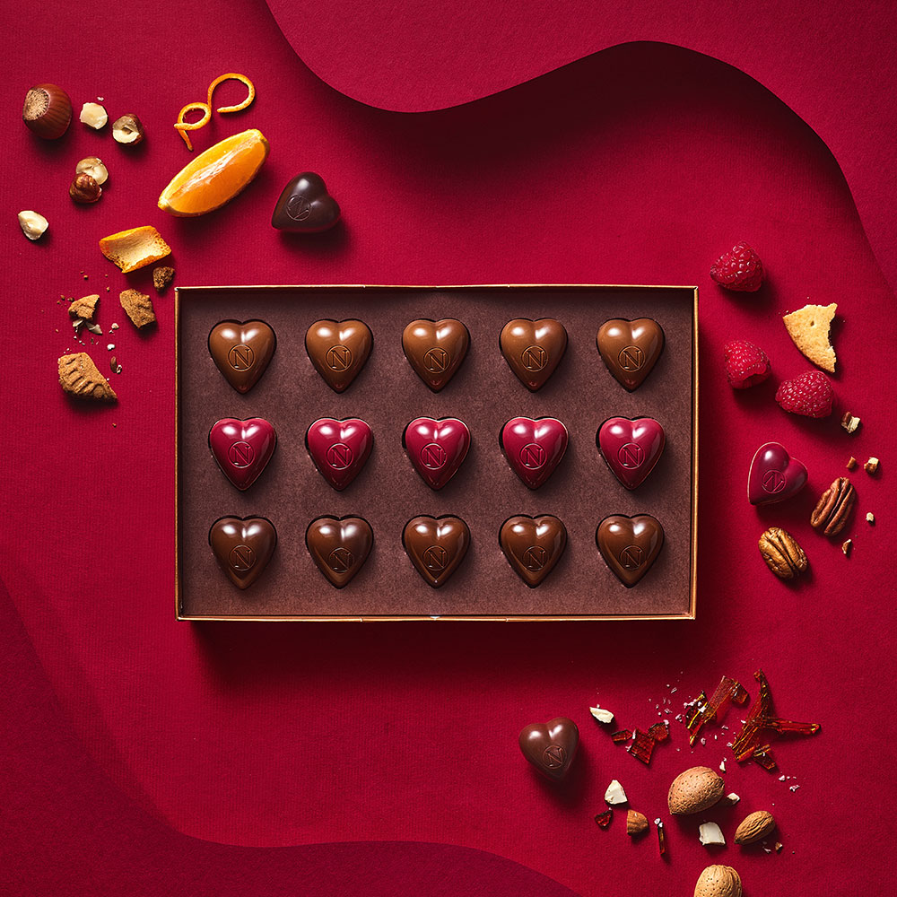 Celebrate love in its most harmonious form with the limited edition Love Letter Box (140 g), A Symphony of Love. This year, our Maîtres Chocolatiers collaborated with Michelin-starred chef Thierry Theys and his wife, restaurant manager Sofie Willemarck, to create three heart- shaped chocolates inspired by their own relationship. Each creation celebrates their love as a harmonious symphony: Thierry designed the intense dark chocolate heart for Sofie, Sofie imagined the tender milk chocolate heart for Thierry, and together they composed the vibrant red heart, a symbol of their love and harmony. Inside, you find: • White / red heart – Raspberry & pecan nut: White chocolate with a bold raspberry ganache and a hint of chilli, balanced by a warm pecan nut and vanilla biscuit praliné. • Milk heart – Salted caramel & almond: A milk chocolate heart filled with a salted butter caramel layer on one side, and a delicately crunchy roasted almond praliné on the other • Dark heart – Speculoos & mandarin: Intense dark chocolate with a crisp speculoos and hazelnut praline , paired with a fresh mandarin ganache.