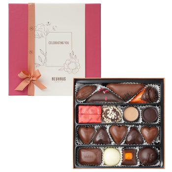 The Mother’s Day Gift Box (123G) contains +/- 9 iconic Neuhaus chocolates; a selection of soft praliné, ganache, caramel and gianduja filled chocolates. As a surprise inside the box, you can also discover the three limited edition heart-shaped chocolates, created by Neuhaus Maîtres Chocolatiers, that invite you to rely on your senses.