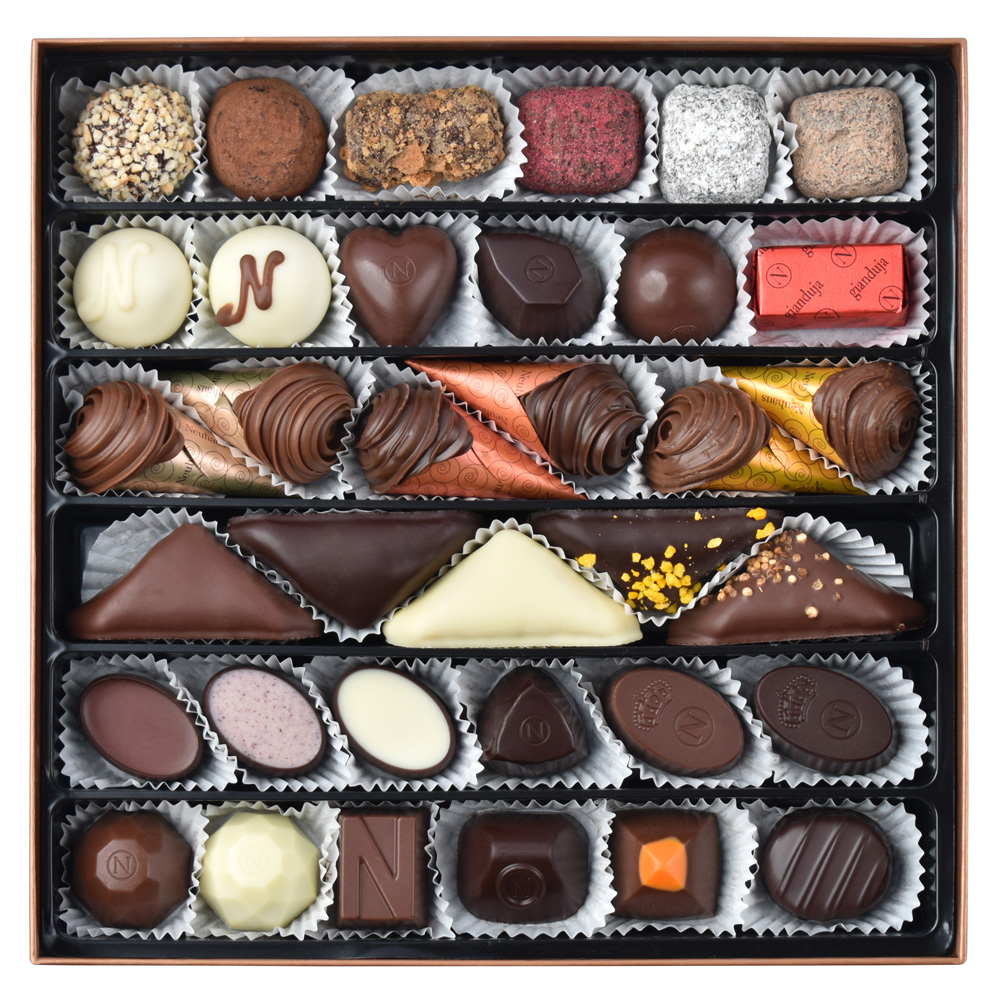 Elegantly displayed in a Prestige gift box, this chocolate assortment is a wonderful VIP gift idea for loved ones, dear friends, and important business gifts.