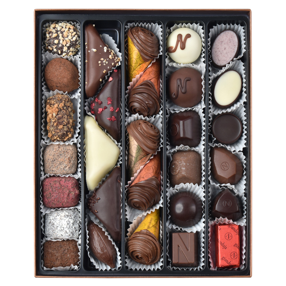 The National Day luxury gift box contains -/+ 29 iconic Neuhaus chocolates: a selection of praliné, ganache, truffles and gianduja filled pralines.