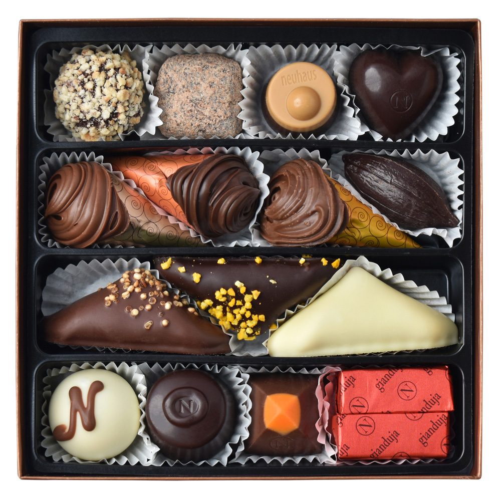 The National luxury gift box contains -/+ 15 iconic Neuhaus chocolates: a selection of praliné, ganache, truffles and gianduja filled pralines.