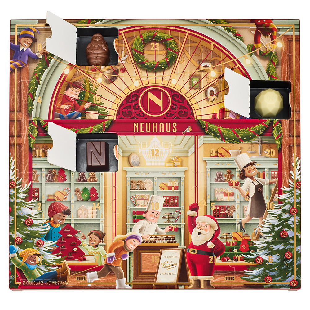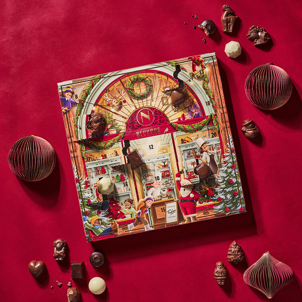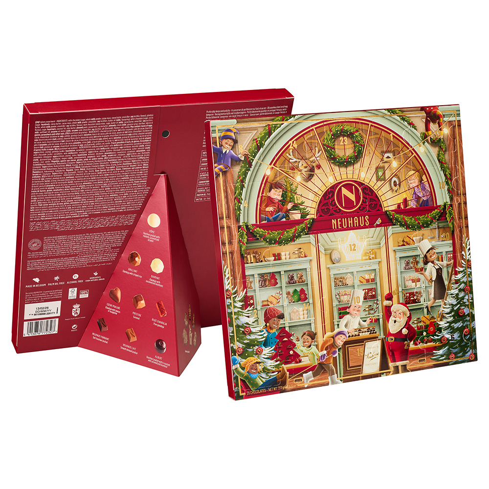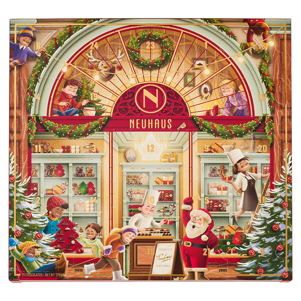 Count down to Christmas with the Classic Advent Calendar (277 g), filled with 25 Belgian chocolates crafted by our Maîtres Chocolatiers. Created for children and just as irresistible for adults, each window hides a delicious surprise: iconic Neuhaus pralines in milk, white and dark chocolate, alongside playful winter figurines filled with creamy praliné. The calendar is alcohol free and beautifully presented, an ideal gift that brings delight each day up to 25 December. Its enchanting illustration sets a festive scene in the historic Galerie de la Reine in Brussels, where the joyful atmosphere of the arcade captures the wonder of Christmas. A thoughtful present for kids and families, and a delicious way to make December feel special.