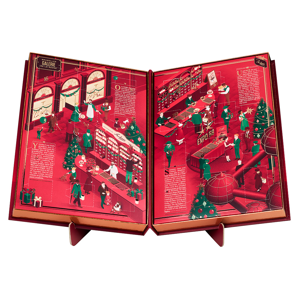The Advent Calendar – Our Chocolate Story (322 g) brings the Neuhaus legacy to life in a beautifully illustrated book with four festive scenes. From our original pharmacy in the Galerie de la Reine in Brussels to the launch of the iconic Irrésistibles at Expo 58, each chapter unveils a milestone in our history, paired with exquisite Belgian chocolates as you count down to the most magical season of the year. Behind 25 doors you will find a refined selection of Neuhaus classics in milk, dark and white chocolate. As an extra treat, the book also includes one of our new star-shaped chocolate from our limited edition Les Souvenirs collection : a milk chocolate star filled with popcorn cream and finished with a touch of salted caramel. With its festive stand and protective sleeve, the book makes a striking centrepiece throughout December.