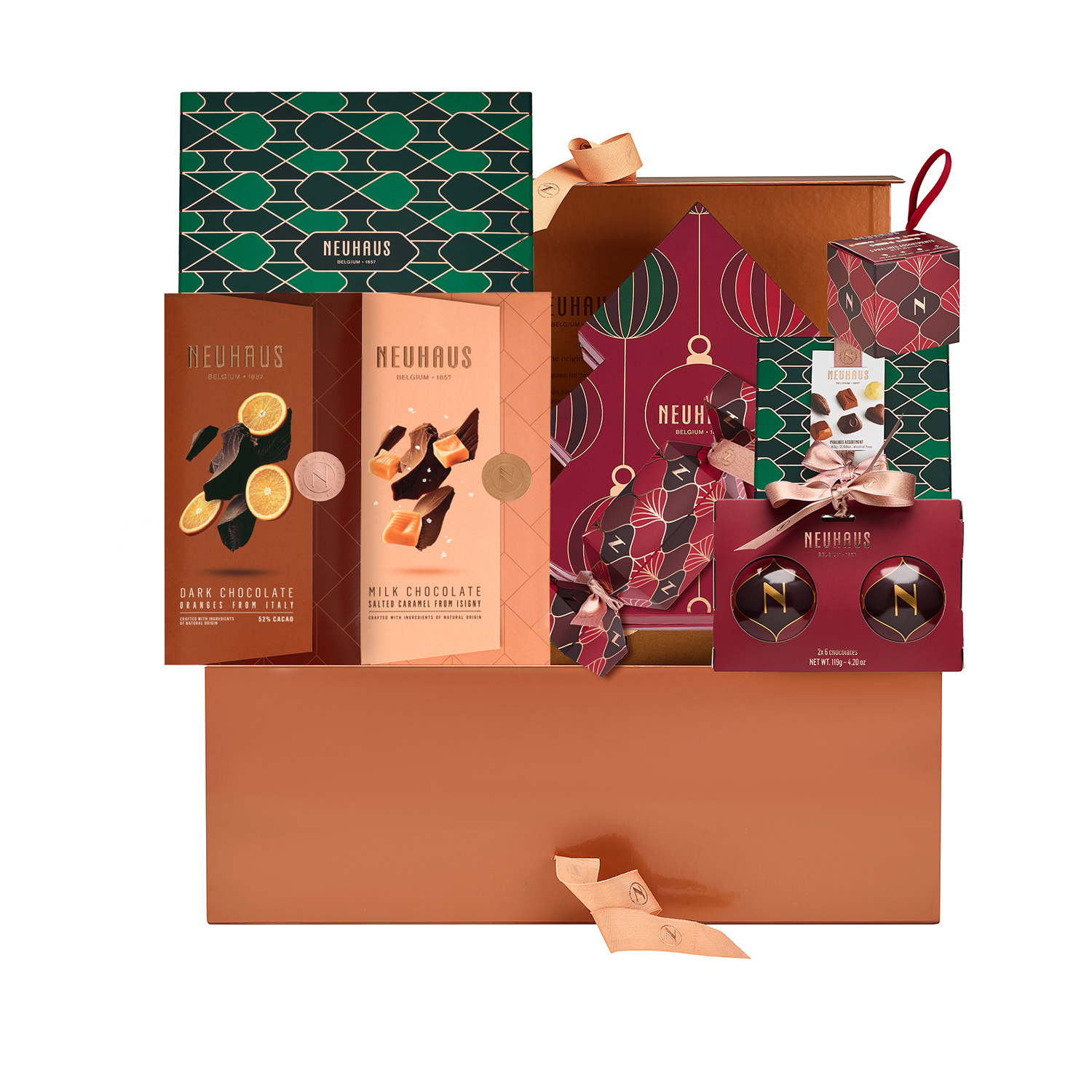 The large Christmas Basket (900G) contains a variety of our most Christmas chocolate essentials.