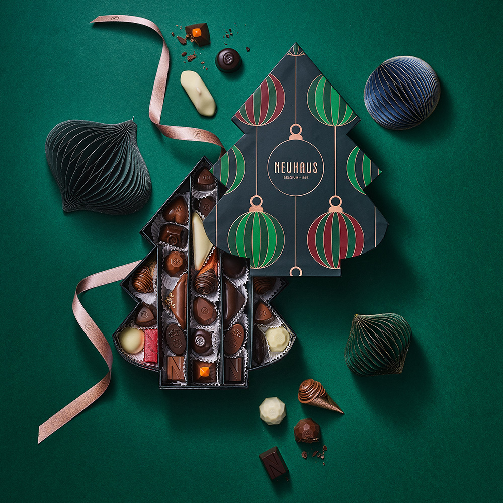 Celebrate the magic of the holidays with our Christmas Tree Box (335 g), a festive tree-shaped box filled with 27 timeless Neuhaus chocolates. Discover a harmonious assortment of milk, dark and white Belgian chocolates, crafted with care by our Maîtres Chocolatiers using the finest natural ingredients. With deep green and copper details, this festive box brings a timeless charm to every celebration. Perfect as a gift for loved ones or as a centrepiece on your holiday table, it celebrates Belgian chocolate craftsmanship at its finest. Inspired by Art Deco nostalgia, the Holiday 2025 collection reimagines our iconic chocolates in refined patterns and festive colours, wrapping up the year with warmth and elegance.
