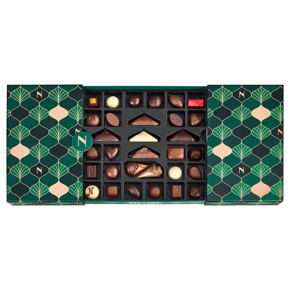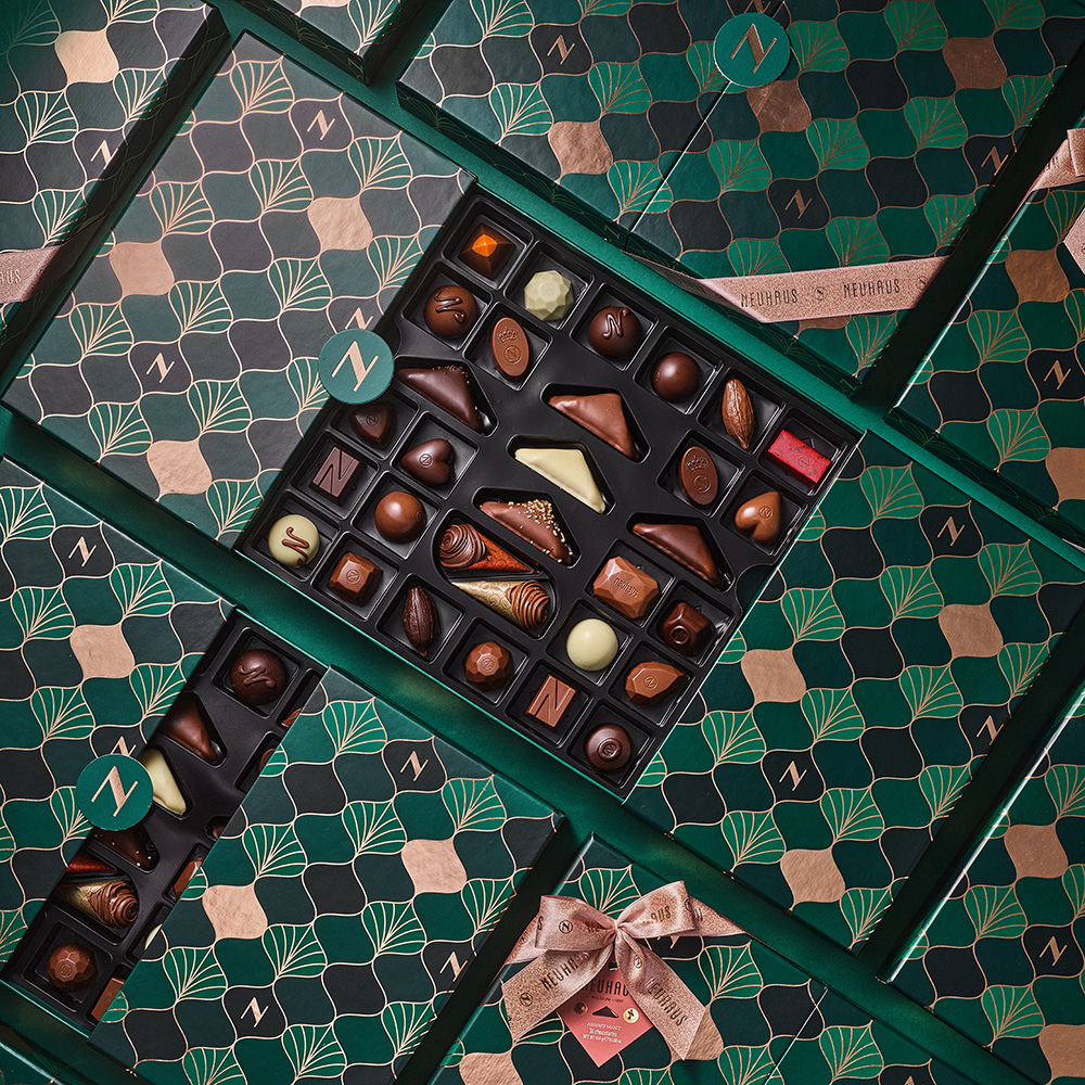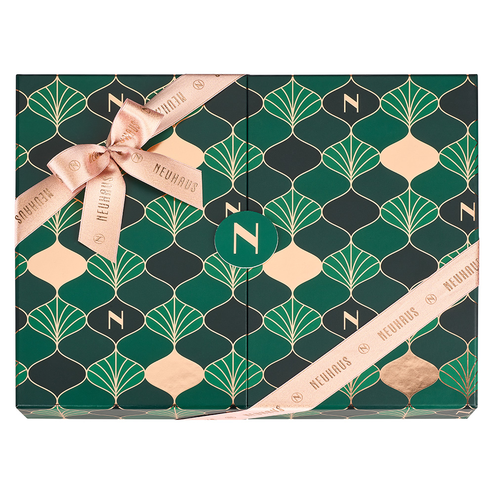 Make every celebration unforgettable with our Festive Sharing Box (414 g), a timeless selection of 31 Neuhaus pralines, crafted to be shared in moments of true togetherness. Inside awaits a refined assortment of milk, dark and white Belgian chocolates, made with passion, precision and the finest natural ingredients by our Maîtres Chocolatiers. Presented in our new Art Deco inspired box and tied with an elegant satin ribbon, this two-layer gift box invites you to share in the joy of Belgian chocolate craftsmanship. Perfect for family gatherings, festive dinners or heartfelt gestures of appreciation, it turns every occasion into a shared indulgence. Inspired by Art Deco nostalgia, the Holiday 2025 collection reimagines our iconic chocolates in refined patterns and festive colours, wrapping up the year with warmth and elegance.