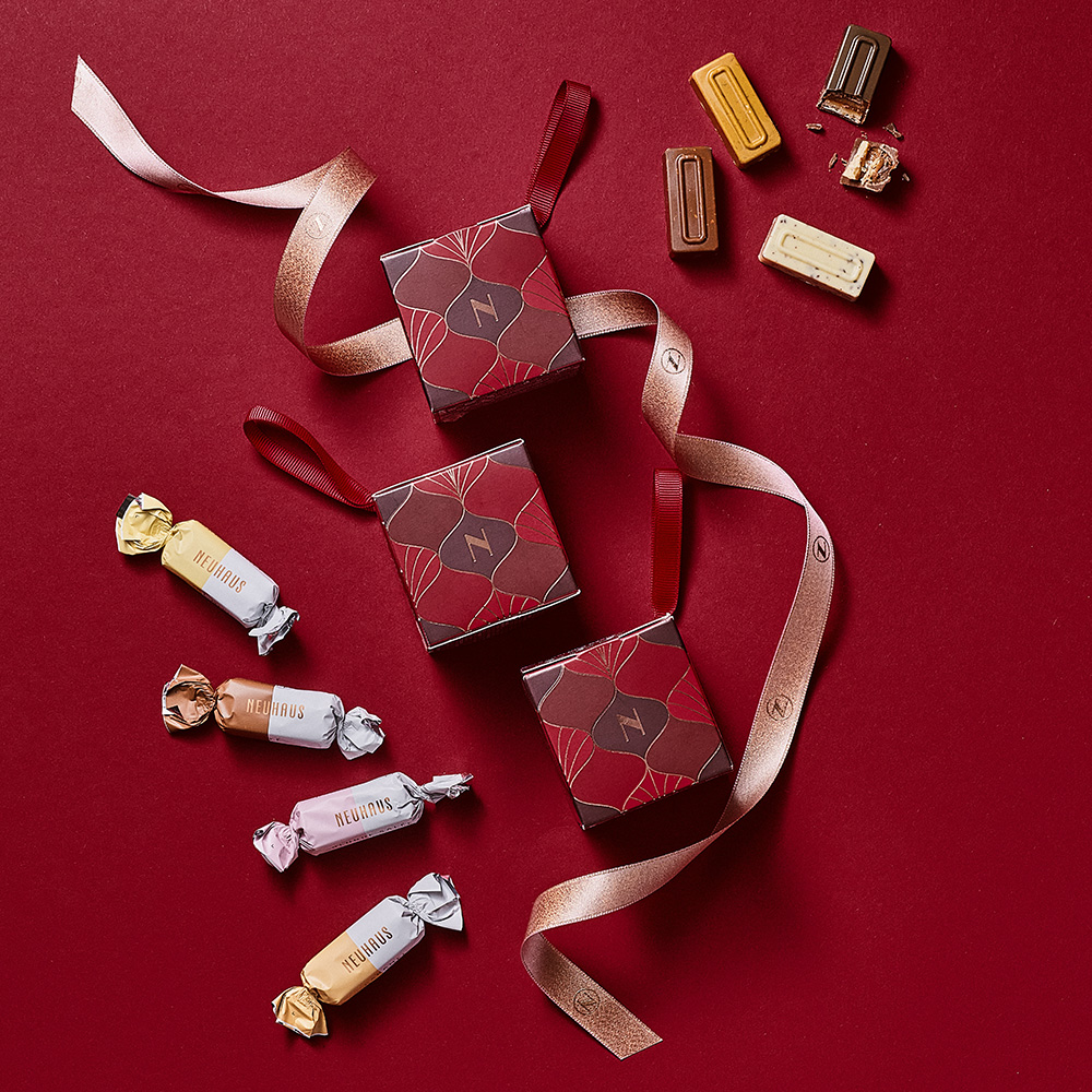 The Christmas Winter Cube (50 g) is a charming red box filled with five individually wrapped Belgian chocolate Amusettes. Each piece, crafted by our Maîtres Chocolatiers, delights with smooth textures and rich flavours that capture the essence of fine Belgian chocolate. Perfect for sharing festive delight or adding a touch of sweetness to your own celebrations. With its elegant ribbon and delicate Art Deco pattern, the cube can be displayed as a beautiful Christmas tree decoration or used as a festive accent on the table. Perfect as a thoughtful small gift or to share a touch of sweetness during the holidays, it brings together festive charm and Belgian craftsmanship. Inspired by Art Deco nostalgia, the Holiday 2025 collection reimagines our iconic chocolates in refined patterns and festive colours, wrapping up the year with warmth and elegance.